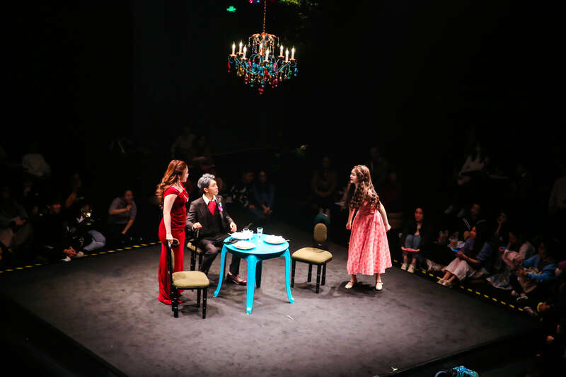 剧场内,观众的坐席被推平,灯光、舞美与多媒体动画相互呼应,剧场空间被打造成一个“童话法式府邸”。观众落座于吧台与蒲团之间,被开放式的“四面台”环绕,近距离感受演员的每一幕表演,剧场工作人员则化身服务员穿梭其间。