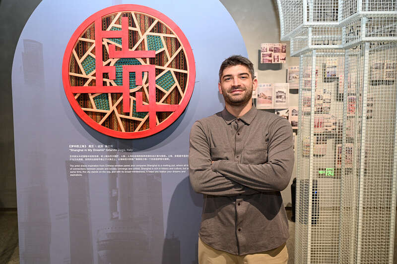 同样生活在上海的,还有来自意大利艺术世家的奥兰·达加(Orlando Daga),他2015年第一次来中国便被吸引,目前一年有一半时间在上海。他从中式窗格中汲取灵感,创作了《梦中的上海》。“圆形的中式窗格,像是宇宙。窗格之后,我用了蓝、红等色的土布,蓝色代表大海、红色代表热情,上海像是大熔炉,人与社会间的各种关联在此汇聚与展现;这座矗立于大海之上的城市,也实现了每个人的理想。”奥兰·达加在接受澎湃新闻采访时说。