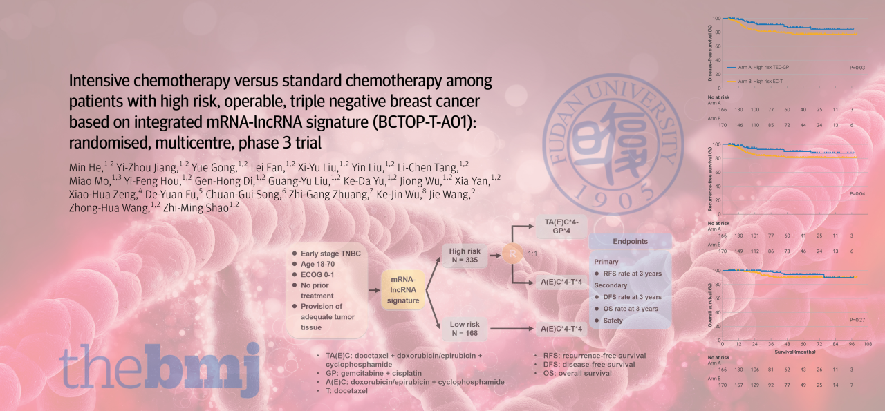 首次前瞻性验证三阴性乳腺癌多基因模型指导精准化疗和预测患者预后的价值。三阴性乳腺癌异质性极高,但目前缺乏针对三阴性乳腺癌的特异模型来指导更精准的治疗策略。研究团队通过开展一项名为“BCTOP-T-A01”的全国多中心临床研究,证实研究团队前期构建的多基因模型可以预测三阴性乳腺癌患者复发风险,多基因模型指导的“蒽环紫杉”序贯“吉西他滨”联合“卡铂”的精准化疗方案能显著提升高危患者生存率超过10%,且该方案安全性可控,患者无严重不良反应。该成果于2024年发表在The BMJ杂志上,并发表同期编者述评。