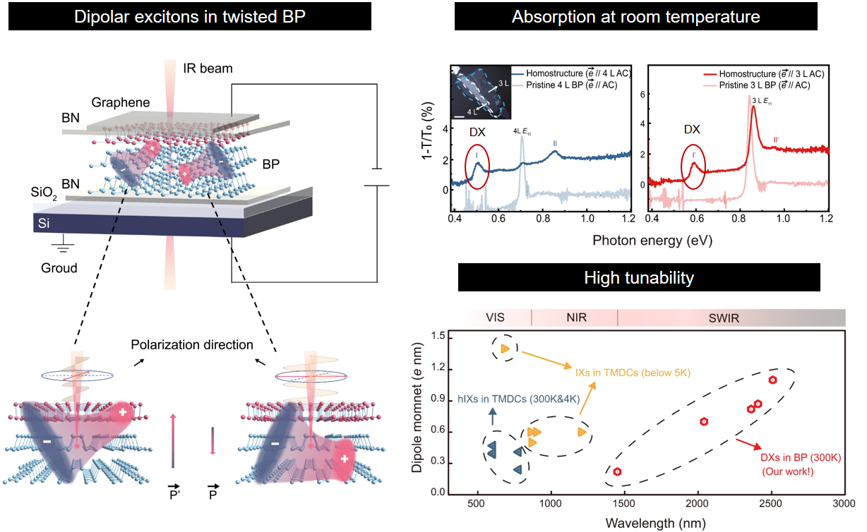 发现全新“明亮”偶极激子,为光学观测量子世界打开一扇窗。研究团队在转角黑磷同质结中发现了一种新型偶极激子。这类激子源于独特的能带结构,无需依赖隧穿效应即可实现显著的光吸收,突破了偶极激子与光相互作用能力弱的瓶颈问题,同时赋予其全新的调控维度。该发现为探索强关联态、多体量子物理和非线性光学等基础研究提供了理想平台。相关成果发表在Science,并获同期Science “视角”栏目评述文章的高度评价。