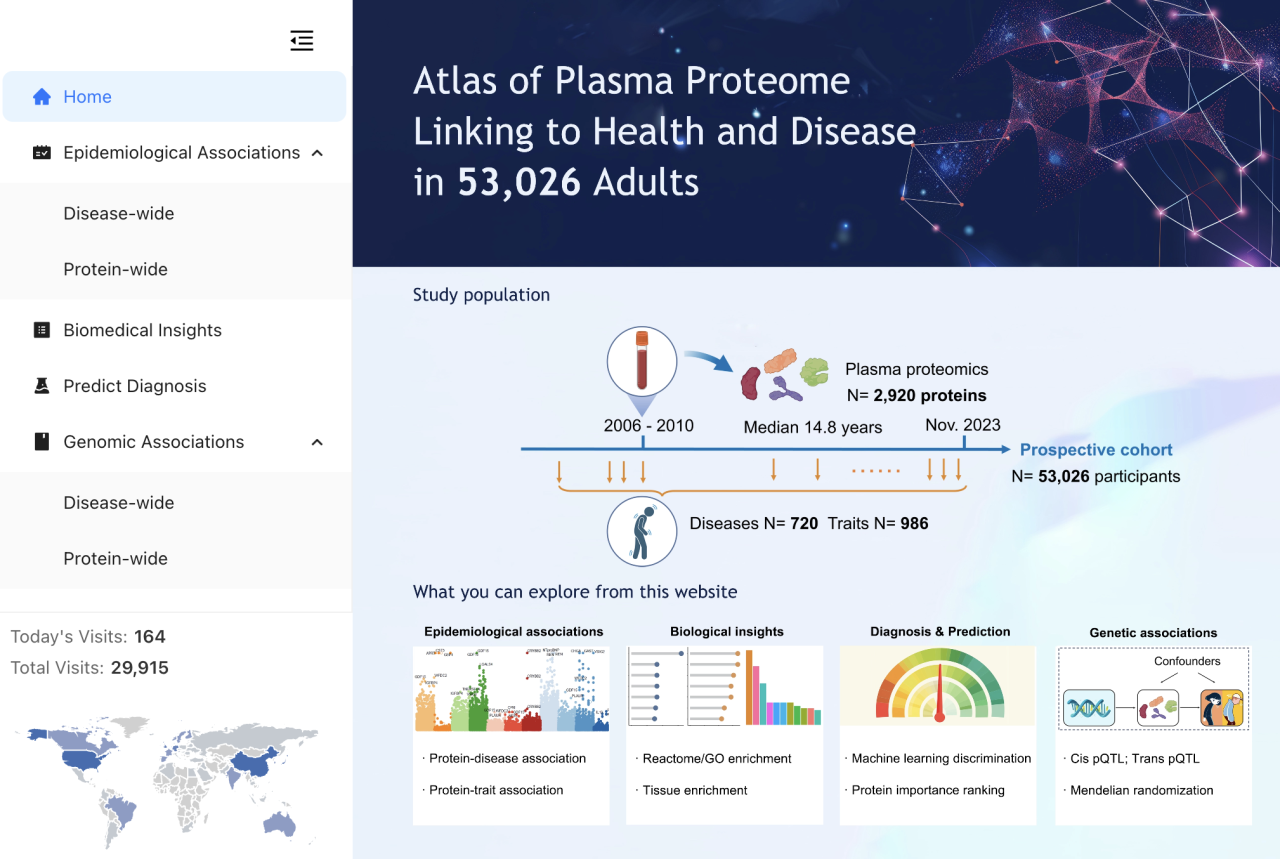 绘制了迄今为止最为全面的蛋白质组图谱,为183种疾病构建了精度良好的预测诊断模型,并发现了26个潜在治疗新靶点。大规模蛋白质组学研究能够深化我们对健康和疾病的理解。研究团队绘制了迄今为止最为全面的蛋白质组图谱,为183种疾病构建了极具潜力的预测诊断模型,并发现了26个潜在治疗新靶点,为精准医学奠定了基础,并建立了可开放访问的蛋白质组-表型组资源数据库,网站上线一个月访问量近3万。论文已于2024年11月22日在Cell杂志发表。