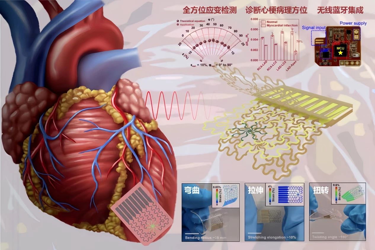 为复杂心脑血管疾病的在体监测提供医工交叉新思路,为未来人机交互的柔性电子系统奠定研究基础。如何能在动态变形的器官表面上进行高分辨率、多方向的应变监测,是复杂心脑血管疾病诊断领域的前沿科学问题。研究团队提出了一种基于单晶硅纳米薄膜阵列的植入式可降解应变传感器,可实现高灵敏度、全轴向360°的应力应变探测,成功在大鼠模型上实现了心肌梗塞病理监测,长期植入后该器件可体内自降解,为复杂软组织生物力学的持续监测提供了新型临床应用技术方案。相关成果于2024年发表在Science Advances和PNAS杂志上。