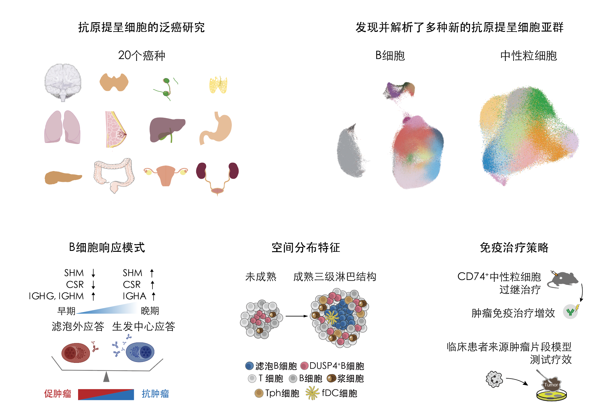 发现并解析了新的抗原提呈细胞亚群,突破了肿瘤免疫治疗领域对B细胞和中性粒细胞的传统认知,为提高免疫治疗的精准性与疗效提供了革命性思路。研究团队发现并深入解析了包括DUSP4+ B细胞和HLA-DR+CD74+中性粒细胞在内的新型抗原提呈细胞亚群,并提出通过改造抗原提呈中性粒细胞促进“热肿瘤”微环境形成的新策略。该研究瞄准了肿瘤免疫治疗中个体差异和疗效有限的痛点,为精准免疫治疗提供了关键理论支撑和技术方向。成果于2024年发表在Cell和Science,同时获Science、Nature Reviews、Cell等50余家媒体和权威期刊的关注。