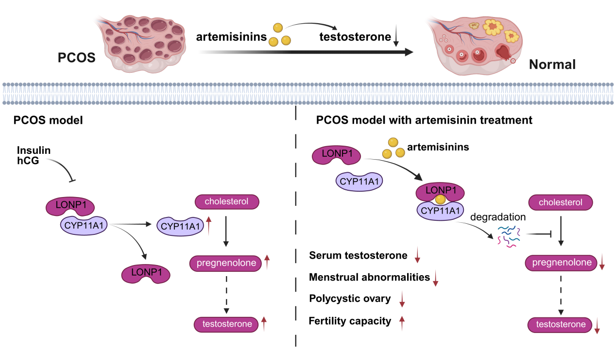 提出了青蒿素治疗多囊卵巢综合征的新策略。多囊卵巢综合征(PCOS)是复杂的生殖内分泌和代谢性疾病,是女性不排卵性不孕的主要诱因,临床治疗缺乏特效药。研究团队揭示了青蒿素在治疗PCOS中的创新性作用,发现青蒿素通过靶向线粒体蛋白酶LONP1抑制卵巢雄激素合成。临床实验证实青蒿素能够同时改善PCOS的三大核心症状,与现有药物相比具有显著优势。研究成果于2024年发表在Science 期刊,获Science及Nature Reviews Endocrinology等期刊亮点推荐。本研究为PCOS的临床治疗开辟了全新方向,有望突破临床缺乏特效药的瓶颈。