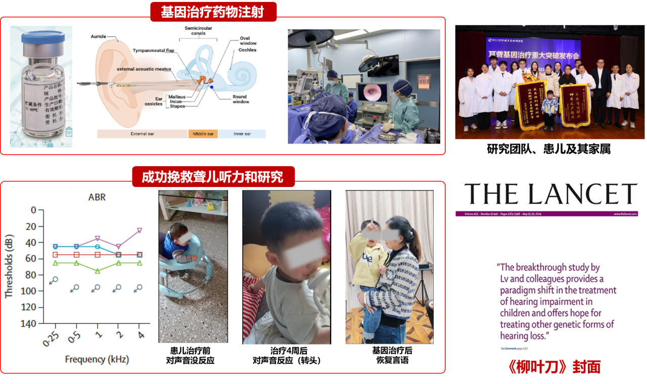 国际首个先天性耳聋基因治疗恢复聋哑患者听力和言语,为耳聋治疗提供范式转变。先天性耳聋患者高达2600万,临床尚无治疗药物。研究团队研发出OTOF耳聋基因治疗药物,主导全球首个先天性耳聋基因治疗临床试验,恢复了聋哑患者的听力和言语;还开发出长期恢复遗传性耳聋模型听力的基因编辑治疗新策略,为更多先天性疾病基因治疗提供借鉴。标志着我国在听觉治疗领域达国际先进水平。2024年发表于The Lancet、Nature Medicine、Nature Biomedical Engineering,且被Lancet选为封面,国际同行评价“开启了耳聋基因治疗新时代”。