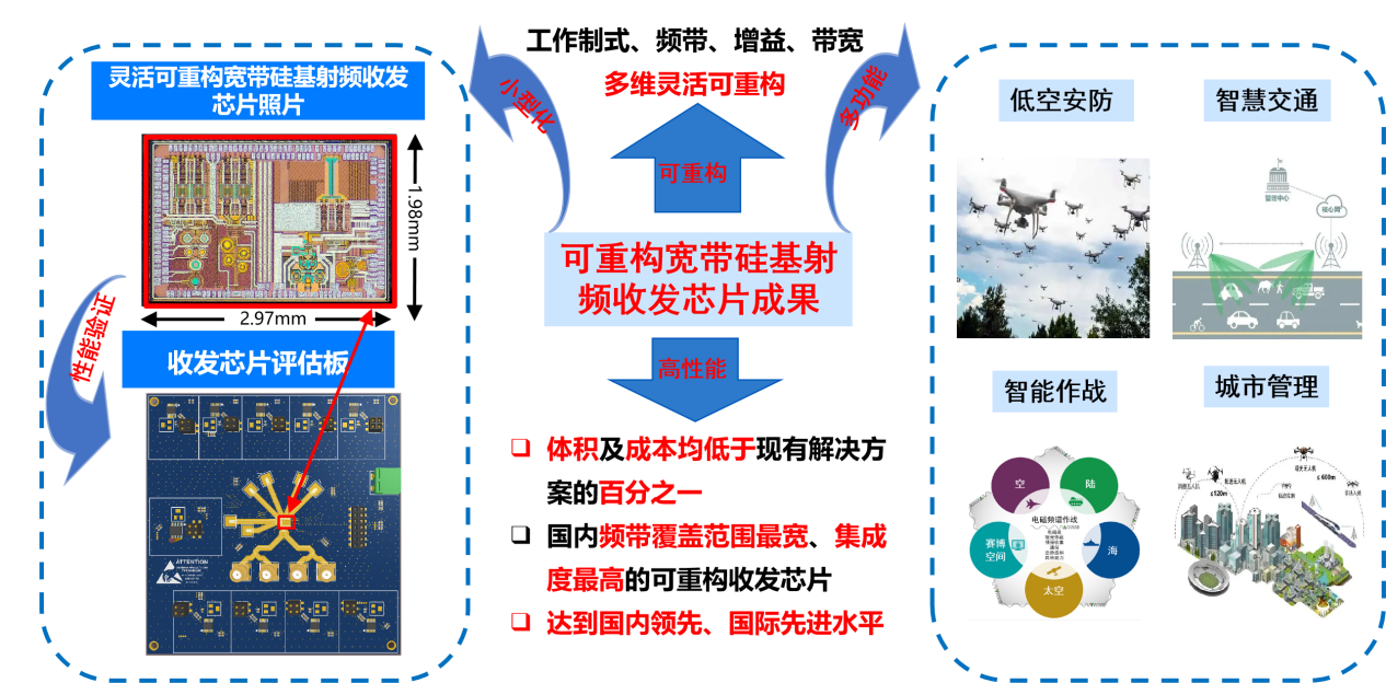 团队研发的高集成度灵活可重构宽带硅基射频收发芯片具备工作制式、频带范围、增益、信号带宽等多维度可重构特性,体积及成本均低于现有解决方案的百分之一,是国内频带覆盖范围最宽、灵活性最强、集成度最高的硅基可重构射频收发芯片。融合通信、感知、计算的多功能一体化是未来通信和军事装备系统发展的必然趋势,其核心难点在于突破集成度和抗干扰瓶颈,完成多芯片系统向单芯片集成的跨越式发展。团队突破了多路径电磁耦合、自适应调谐滤波、多环路反馈抗干扰等关键理论,实现一款超宽带高集成度可重构射频收发芯片,为军民多领域创新应用以及现代军事装备一体化、小型化、智能化提供强有力的技术支持。相关成果已被集成电路设计领域顶级会议、被誉为“芯片奥林匹克”的IEEE ISSCC及固态电路顶级期刊IEEE JSSC录用并发表。