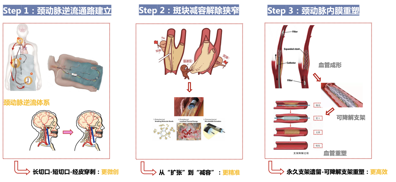 颠覆性颅内外血管疾病诊疗技术变革,可实现“斑块清除、全腔内修复、全过程脑保护”的创新理念。颈内动脉狭窄是缺血性脑卒中的重要原因。如何在保证安全的前提下,有效清除斑块、恢复血流已成为关键挑战。本团队自主研发了经皮颈动脉穿刺逆流脑保护血运重建系统,于2024年1月实现了1050万的转化签约。进一步完成了22例单中心临床试验,成功应用了PCAR系统,验证了其良好的安全性和疗效。全球首例PCAR临床病例报道也发表于JACC子刊。PCAR的成功主要是由于其“三全”的治疗特点,即“全清除斑块、全腔内微创、全程脑保护”。基于该成果的全国多中心临床研究正在稳步推进中。