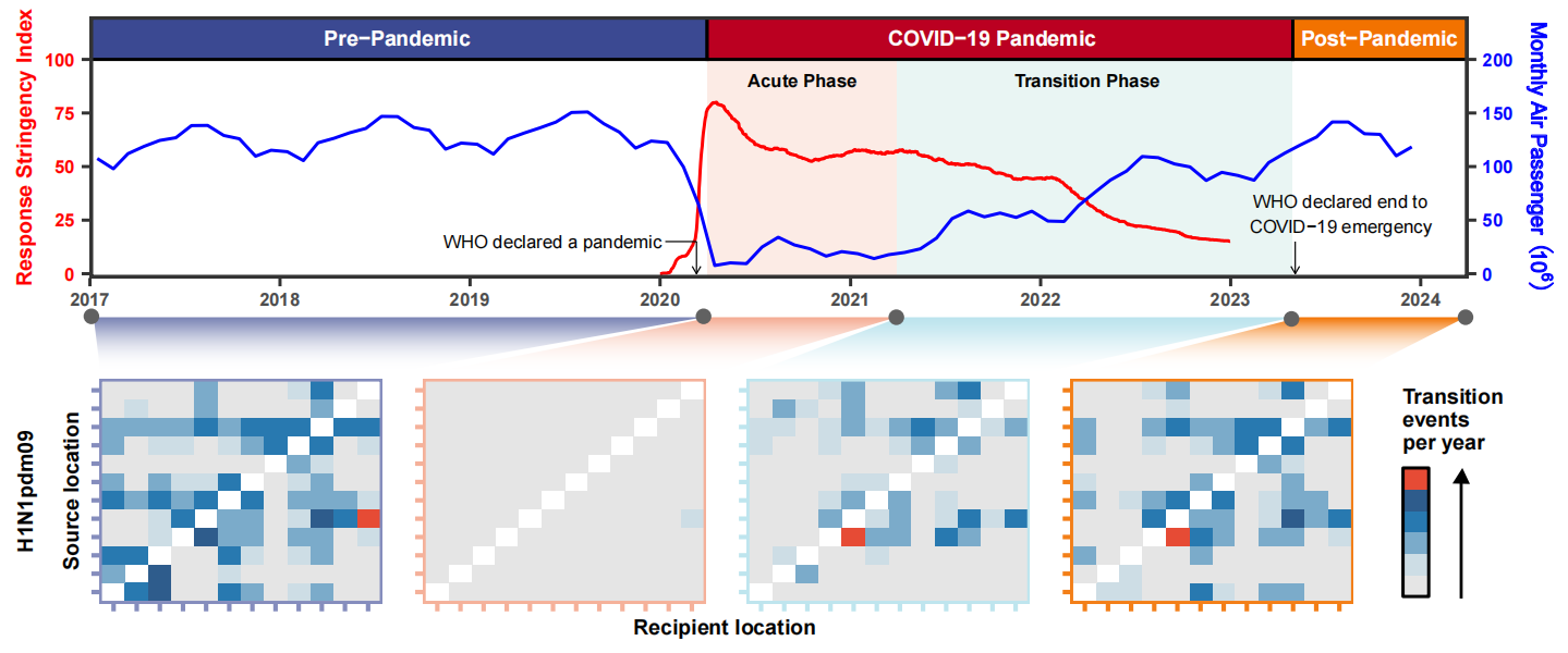 揭示全球大流行事件如何重塑全球季节性流感的传播,为未来季节性流感的精准防控奠定基础。研究团队识别了大流行事件中季节性流感的全球流行特征和传播关键区域,首次定量阐明了大流行后流感传播模式的稳健恢复,为季节性流感防控方案的制定提供了关键证据。相关成果于2024年发表在Science,同期配发专家述评。