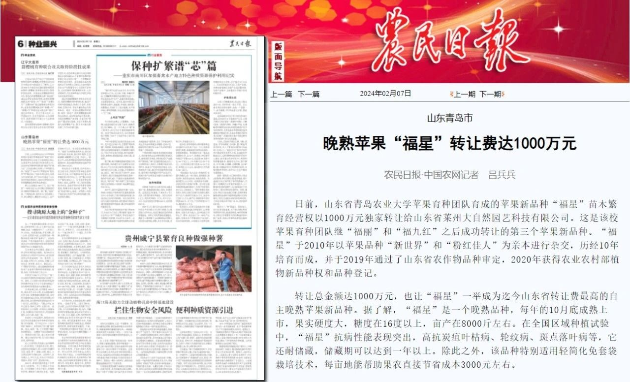 《农民日报》报道了园艺学院苹果育种团队育成的苹果新品种“福星”苗木繁育经营权以1000万元独家转让给山东省莱州大自然园艺科技有限公司。