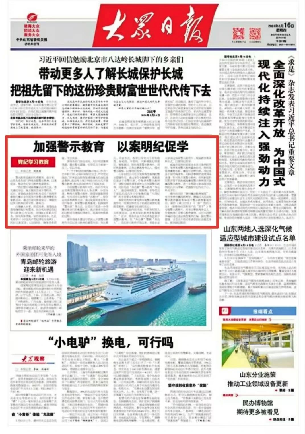 《大众日报》头版“党纪学习教育”专栏报道了学校持续加强警示教育,以案促学,推动党纪学习教育走深走实。