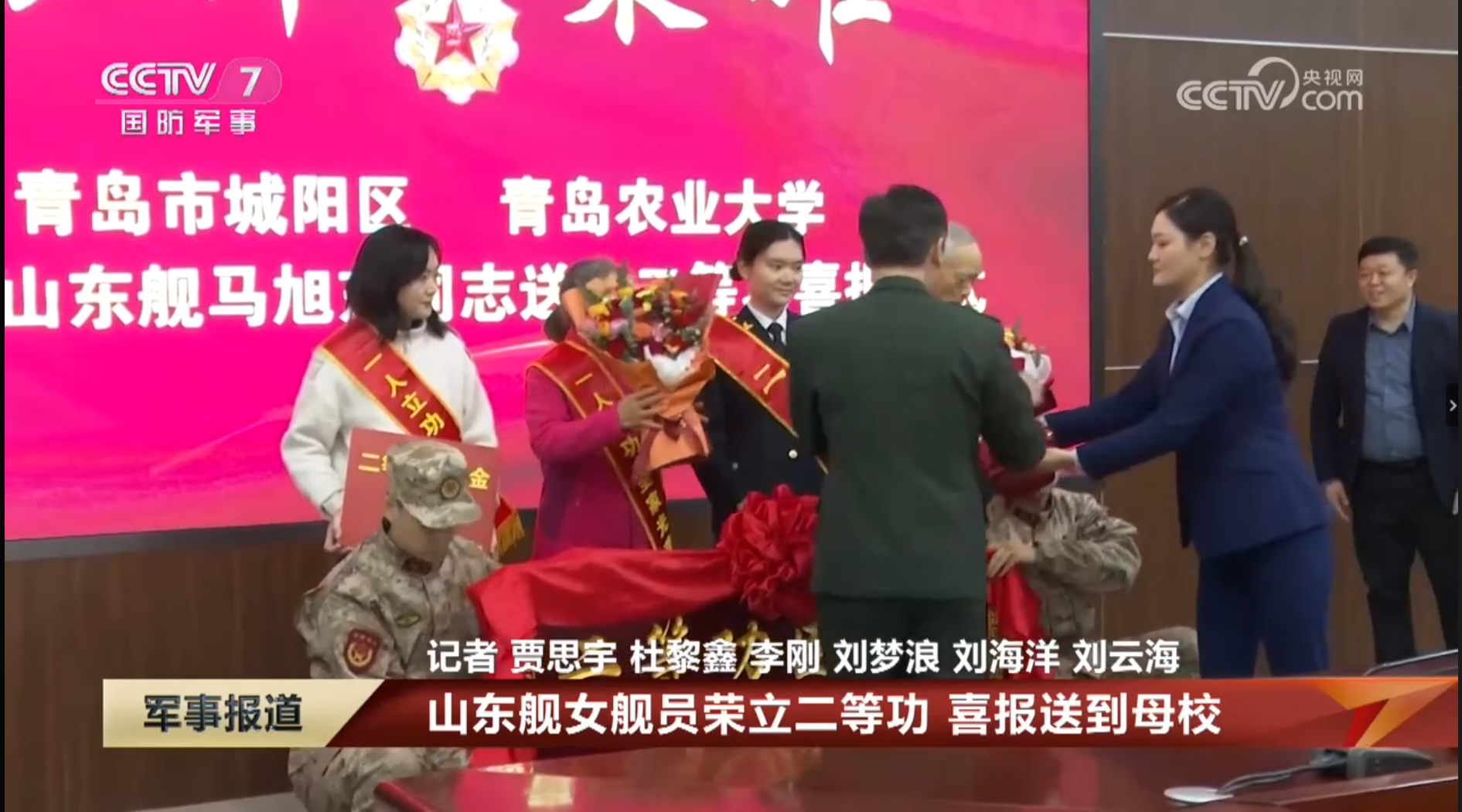 中央电视台CCTV 2报道了园艺学院2020届毕业生马旭东同学入伍后,在2023年度副战区级和战区级专业技术比武中均夺得第一名,贡献突出,荣立二等功。学校专门举办喜报颁发仪式,现场为马旭东及家属送达喜报和牌匾。