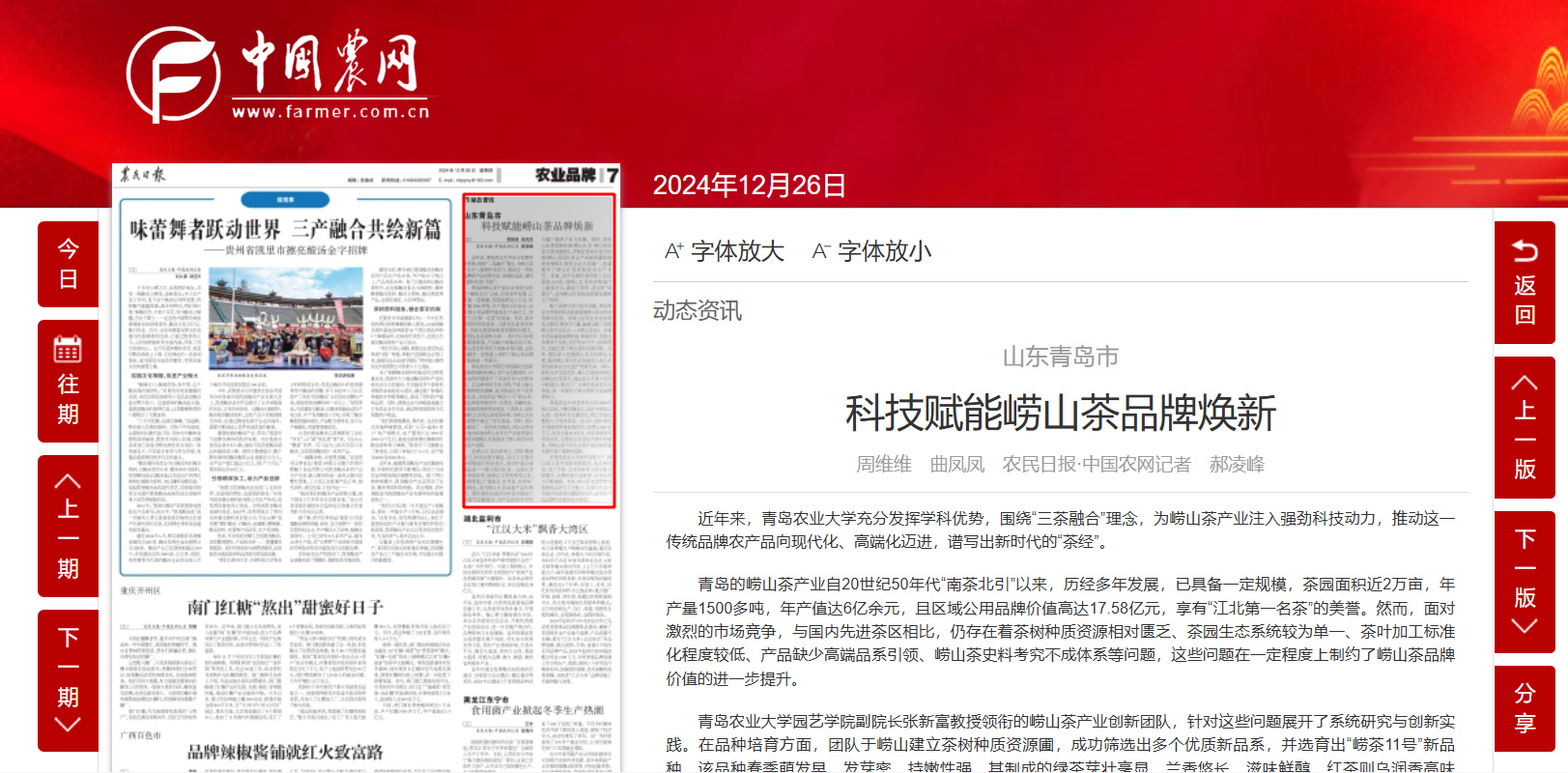 《农民日报》报道了青岛农业大学充分发挥学科优势,围绕“三茶融合”理念,为崂山茶产业注入强劲科技动力,推动这一传统品牌农产品向现代化、高端化迈进。