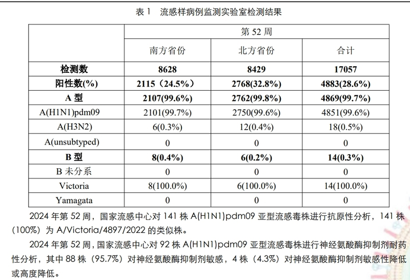 1月2日,中国疾控中心发布全国急性呼吸道传染病哨点监测情况(2024年第52周),2024年12月23日—12月29日,结果分析显示,目前急性呼吸道传染病总体呈现持续上升趋势,不同病原体导致感染的走势存在差异。流感总体处于季节性流行期,流感病毒阳性率快速上升。同一天,中国疾控中心发布的2024年第52周第837期中国流感监测周报显示,本周南、北方省份流感病毒检测阳性率继续上升,以A(H1N1)pdm09亚型为主,90%以上为甲流。