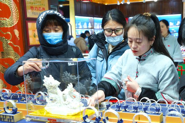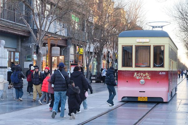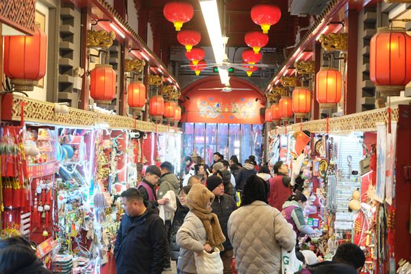 2025年1月8日,游客在北京前门大街赏景购物品北京小吃。春节临近,北京前门大街周边人流大幅度增加,处处生机勃勃,节日氛围浓厚。