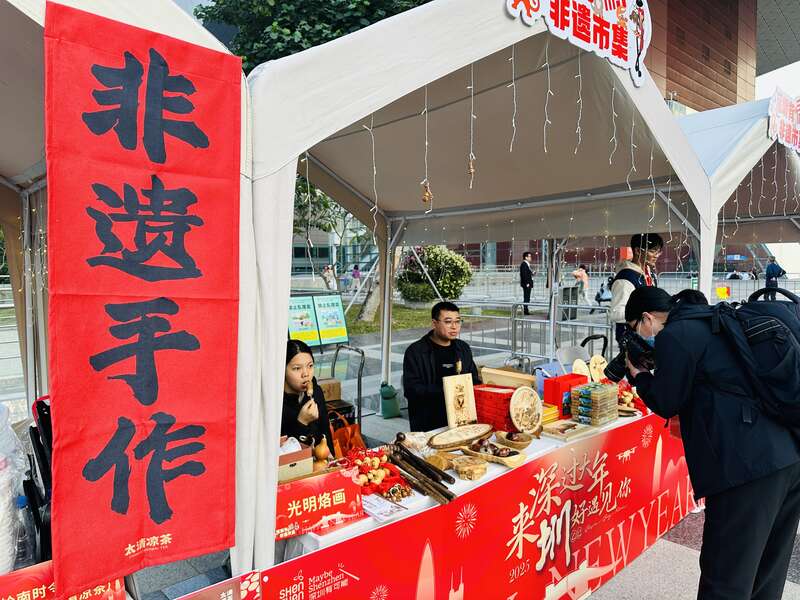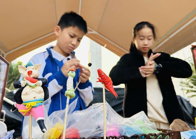 现场,主办方设置的非遗市集吸引了众多市民、游客打卡体验。在面塑展位前,来自深圳市坪山实验学校老师马洪淼带着两名学生展示了这项技艺。马洪淼介绍,该校推出“三维度七书院”的“优才课程200+”课程体系,开设了特色面塑美术课堂,结合面塑的传统属性融合食品,推出可食用的独特面塑。