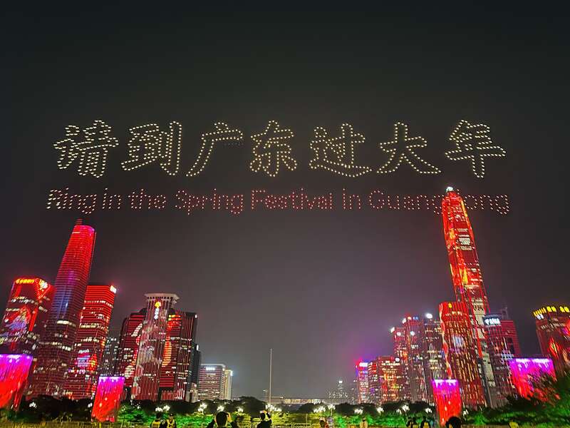 当晚,深圳市福田区市民中心周边43栋楼宇及其公共空间上演了一场主题为“请到广东过大年”与“辉煌新时代”的主题灯光秀。与此同时,千架无人机出现在深圳夜空中,编排出“请到广东过大年”“来深过大年、圳好遇见你”等字样,为这场文旅盛宴增添一抹亮丽的色彩。