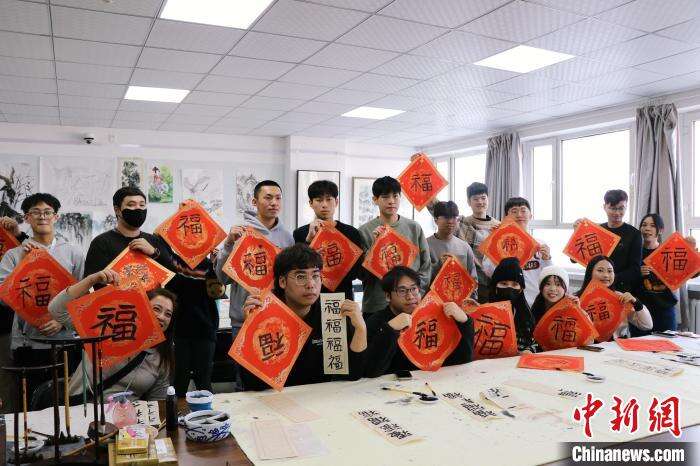 在新疆大学开设的公共艺术选修课上,书法老师向两地青年教授了“福”字的多种写法,大家纷纷拿起毛笔,在四方红纸上写下大大的“福”字,向彼此送上新春祝福。