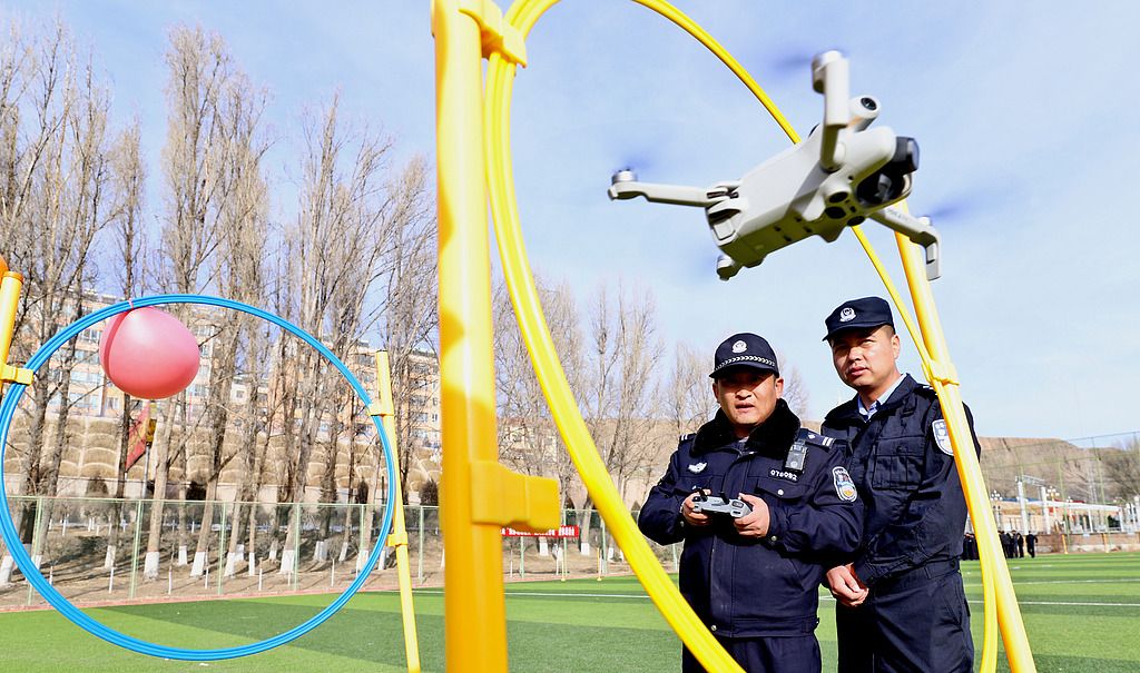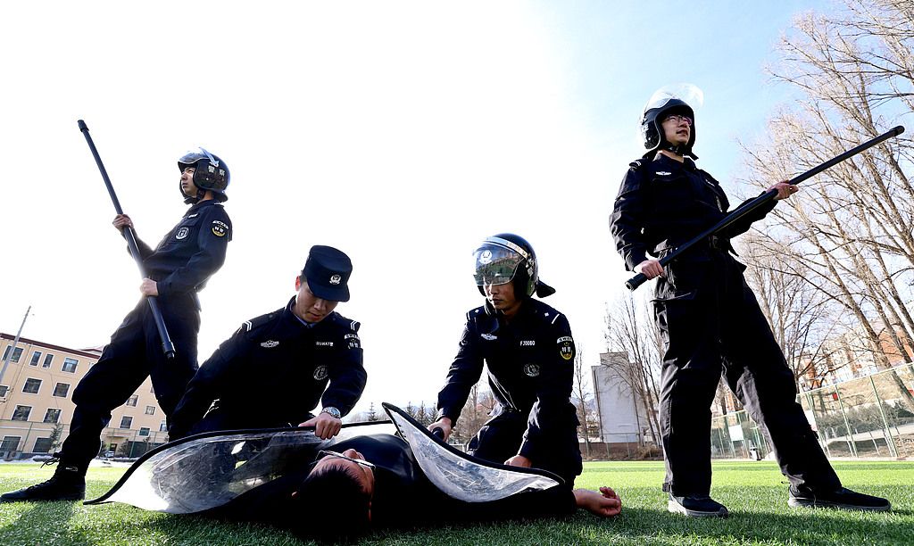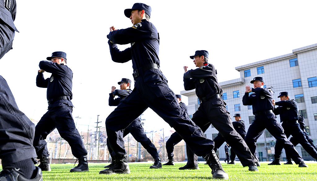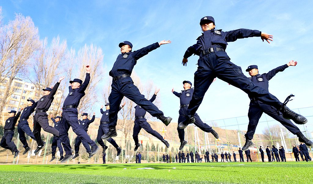 2025年1月8日,甘肃省张掖市,肃南裕固族自治县公安局训练场上,特警在进行警务实战和体能训练比赛。 当日,甘肃省张掖市肃南裕固族自治县公安局“强体魄砺精兵·展风采铸警魂”警体运动会举行,特警、交警、刑警、森警等100多名警察展开礼仪队列、警务技能抓捕、进攻防守技术、警棍盾牌术、交通指挥手势操、最小单元警情处置、往返跑、绕杆跑、跳绳、仰卧起坐等多项“警”彩纷呈的警营文体与锤炼出过硬本领相结合的比赛活动,多警种的警察们在乐享运动,警“彩”超燃的砺精兵比赛中,迎接即将到来的“第五个人民警察节”。