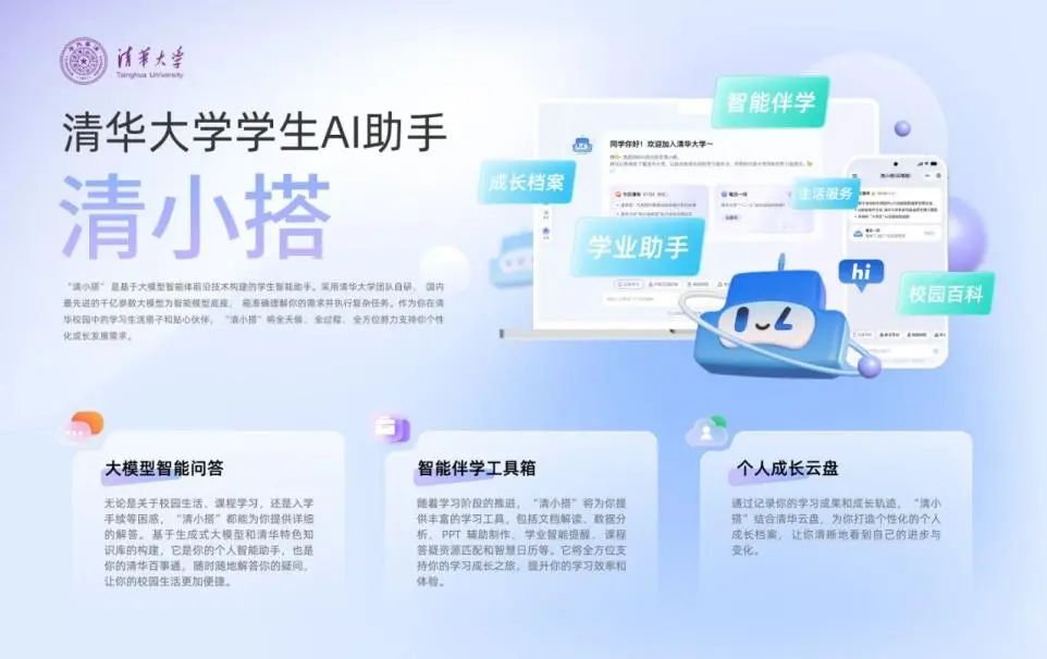 2024年8月14日,本科生新生开学第一天,由清华大学研发的AI成长助手“清小搭”上线,为每位新生提供着“全过程、全方位、全天候”的陪伴。