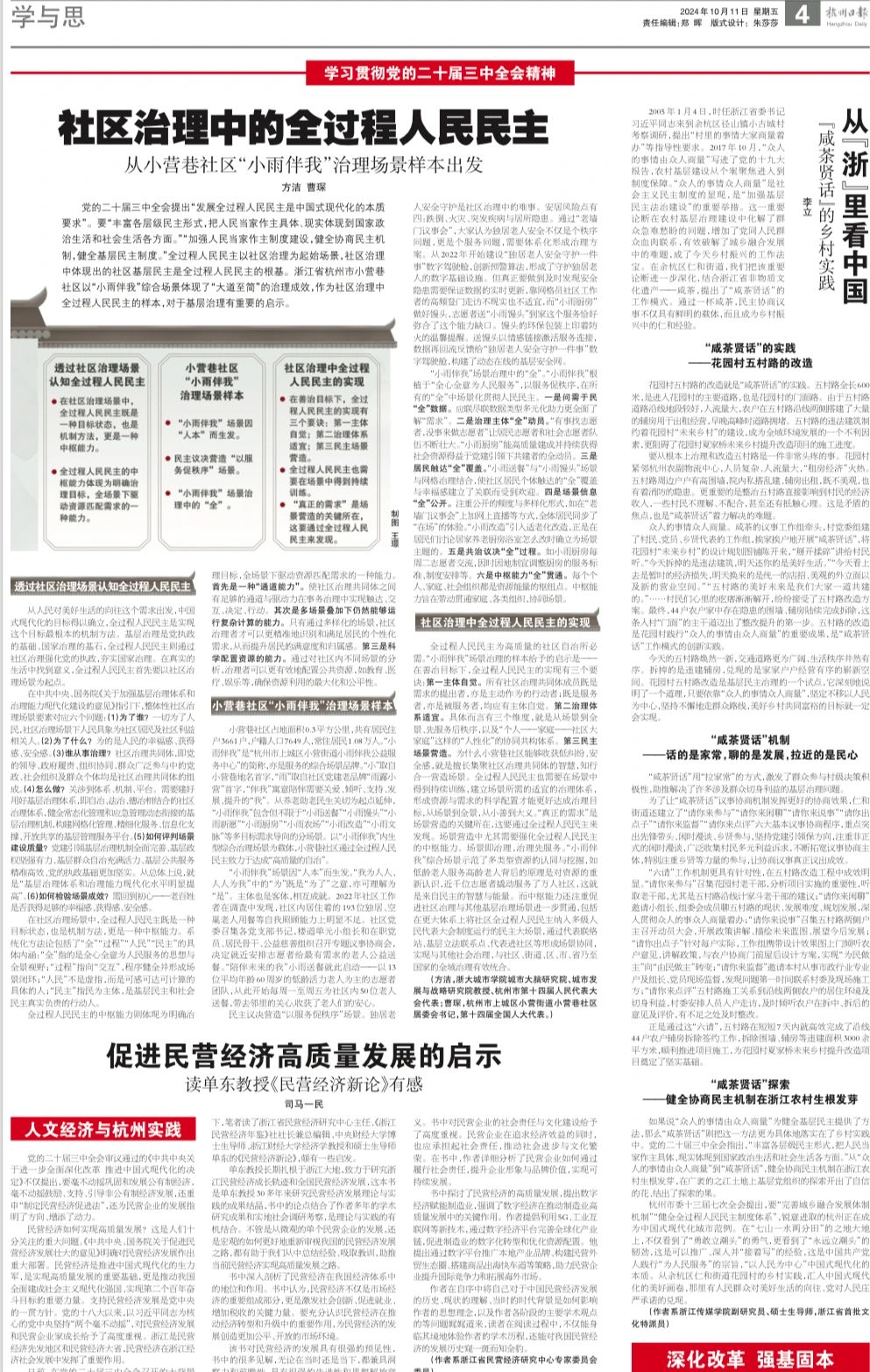 通过全过程人民民主的协商模式,村委会组织面对面交流、村民参观等方式,逐步让村民从最初的抵触到理解和支持,最终顺利改造了原本杂乱的花园村五村路,成为乡村治理的典范。这一故事也被李立理论化,发表在了2024年10月11日的《杭州日报》理论版上。