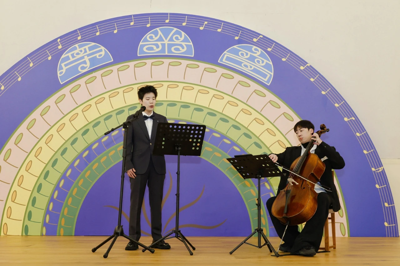 上海音乐学院大提琴演奏家阮佳航和歌唱家朱晴晴演奏《国立艺术专科学校校歌》与《西湖博览会会歌》