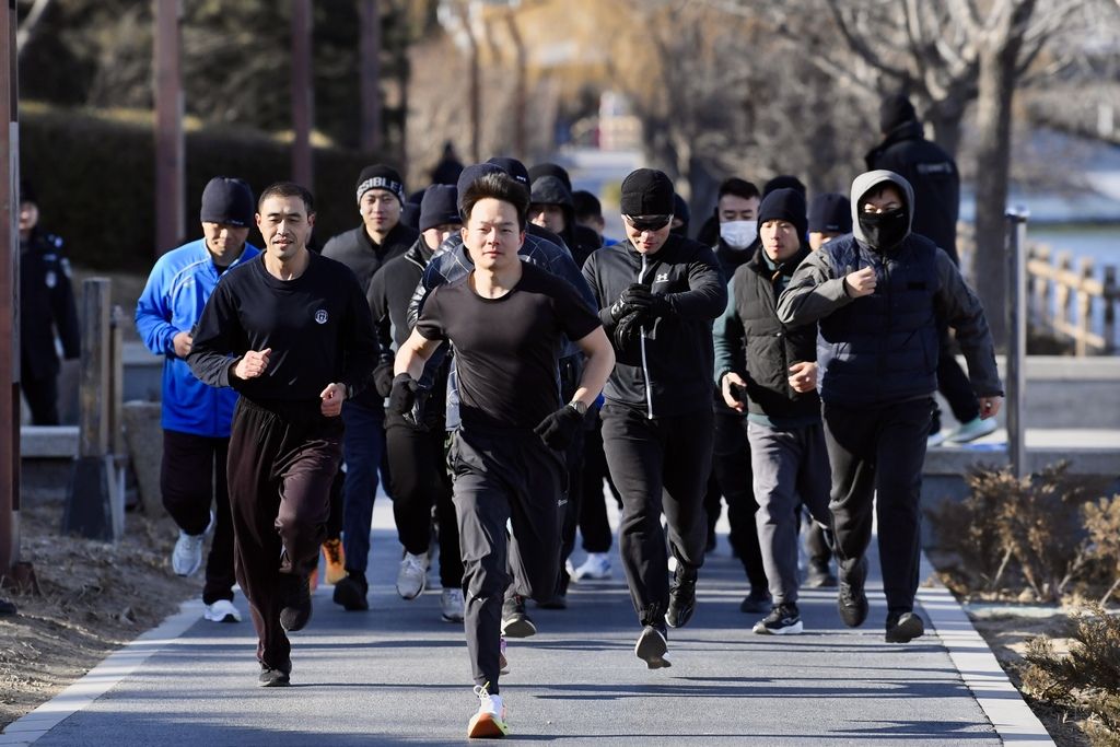 2025年1月8日,北京铁路公安处特警支队的冬训场地,模拟警情全员冬训演练期间,特警队员进行户外五公里跑训练 。