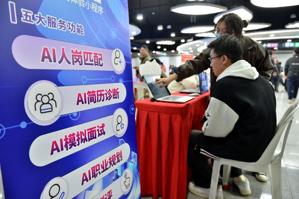 2025年1月10日,福州,现场设置的AI求职体验区吸引应聘者体验。当日,“好年华 聚福州”2025年就业援助月专项活动——综合类专场招聘会在福州南门兜地铁站内举行,30多家企事业单位提供700多个岗位。 中新社记者 吕明 摄