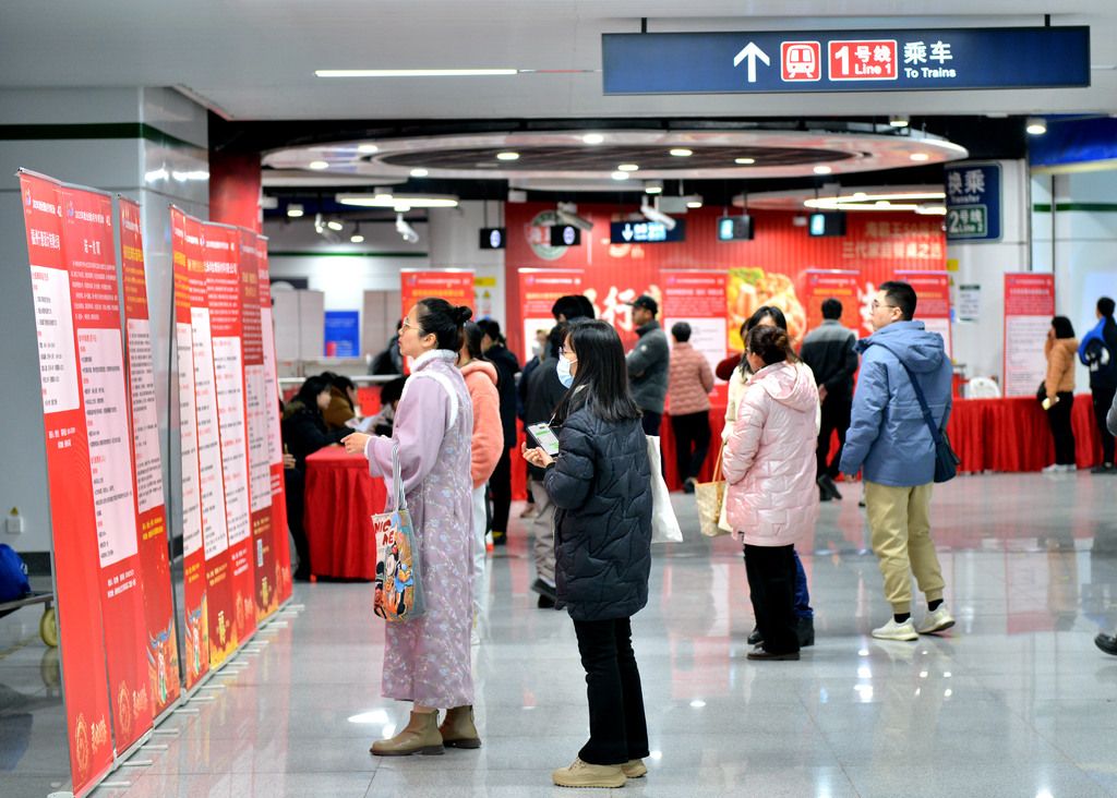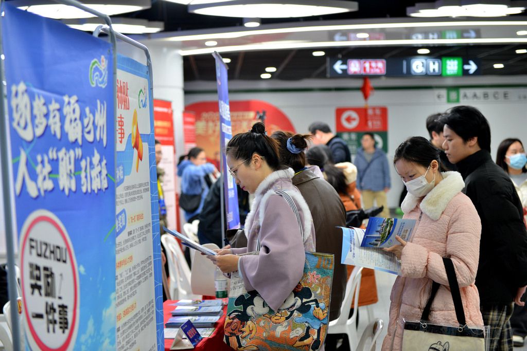 2025年1月10日,福州,应聘者在现场寻找心仪的企业。当日,“好年华 聚福州”2025年就业援助月专项活动——综合类专场招聘会在福州南门兜地铁站内举行,30多家企事业单位提供700多个岗位。 中新社记者 吕明 摄