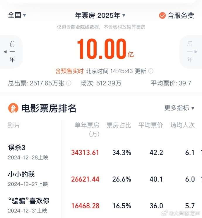 2025年电影票房破10亿 TOP3你看过哪一部?