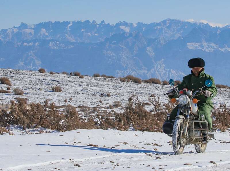 1月7日,肉孜·萨迪克骑着摩托车在乌什县亚曼苏柯尔克孜族乡别迭里山谷巡逻。