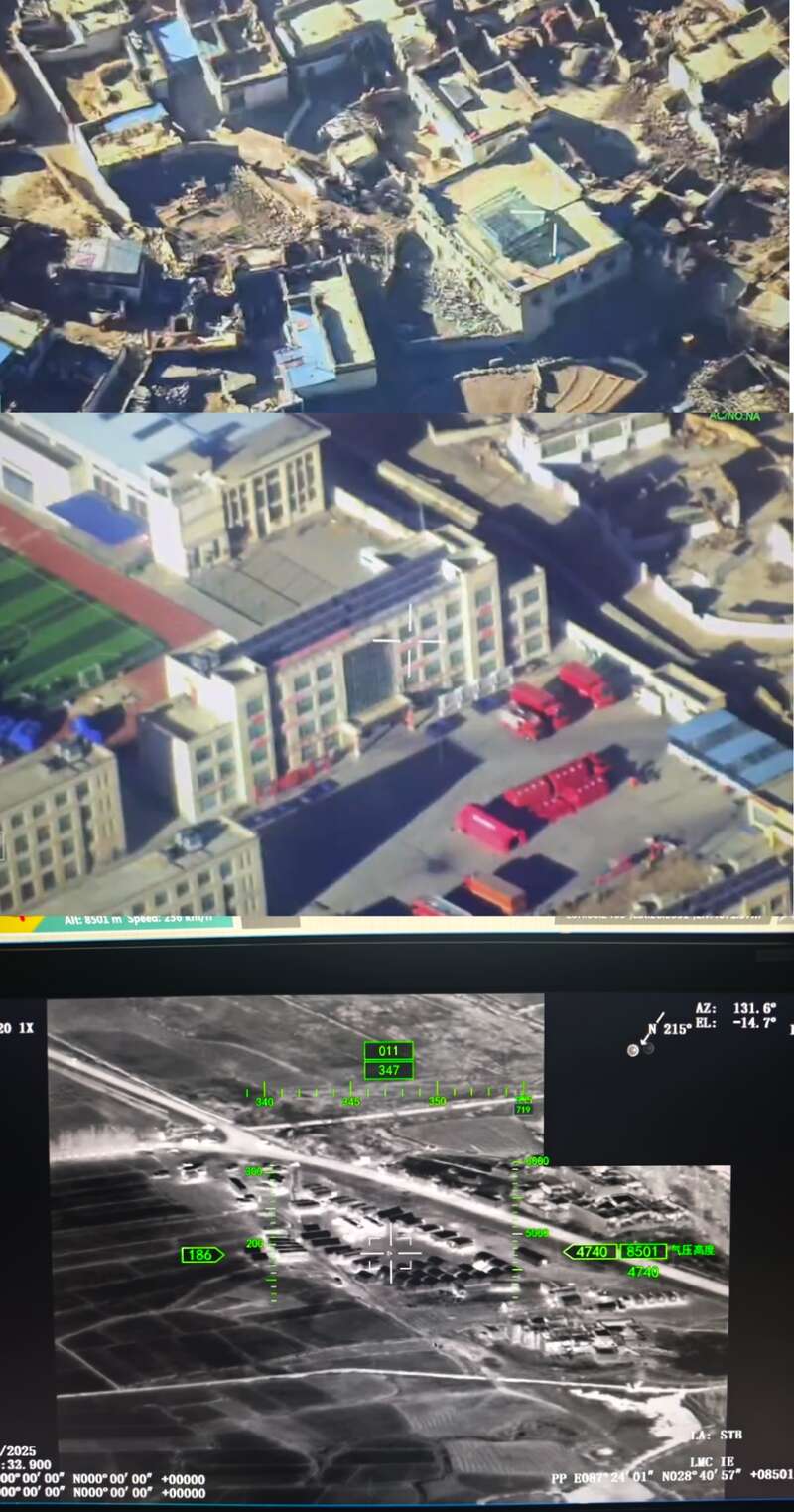 在高海拔、高寒、地形复杂等特殊应急救援条件下,翼龙-2H应急救灾型无人机通过搭载的光电设备和合成孔径雷达等专用任务载荷,成功侦察到多处关键灾情信息,包括房屋倒塌、人员受困点位、救援安置点的布局以及地面救援力量的实时分布,在夜间低能见度条件下,无人机同样提供稳定的外界图像和数据,实现对灾区的多谱段侦察,打通灾情传递的“最后一公里”。