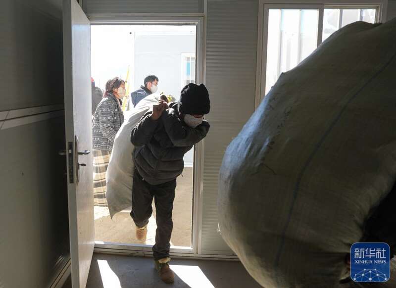 1月10日,在定日县长所乡古荣村,受灾群众将领取到的过冬物资搬入板房。