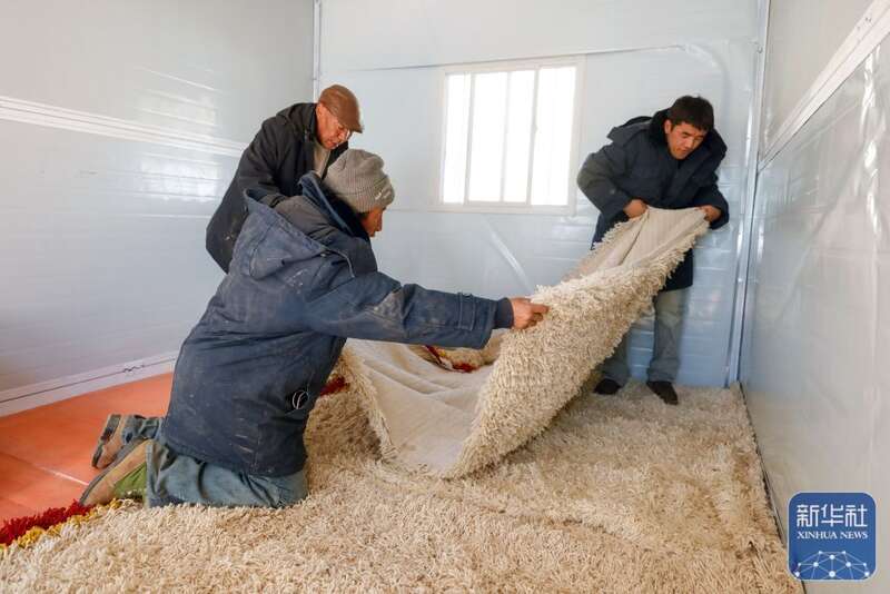 1月10日,在定日县长所乡古荣村,搬入板房的受灾群众在铺临时床铺。