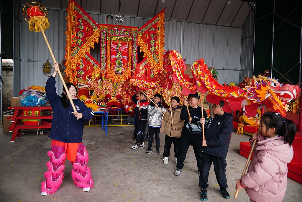 2025年1月11日,昆明,小朋友练习舞龙。寒假伊始,由昆明市龙狮运动协会举办的首届龙狮少年冬令营在昆明举行,吸引了众多小朋友前来参与,孩子们在专业老师的指导下,学习舞龙舞狮技艺,沉浸式体验非遗文化的独特魅力。 中新社记者 刘冉阳 摄