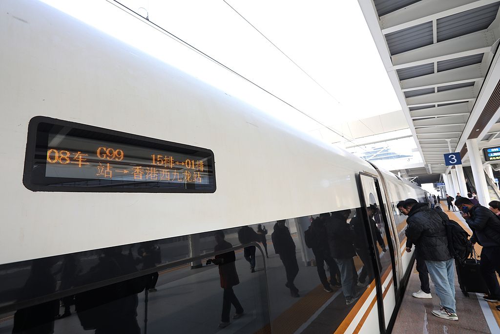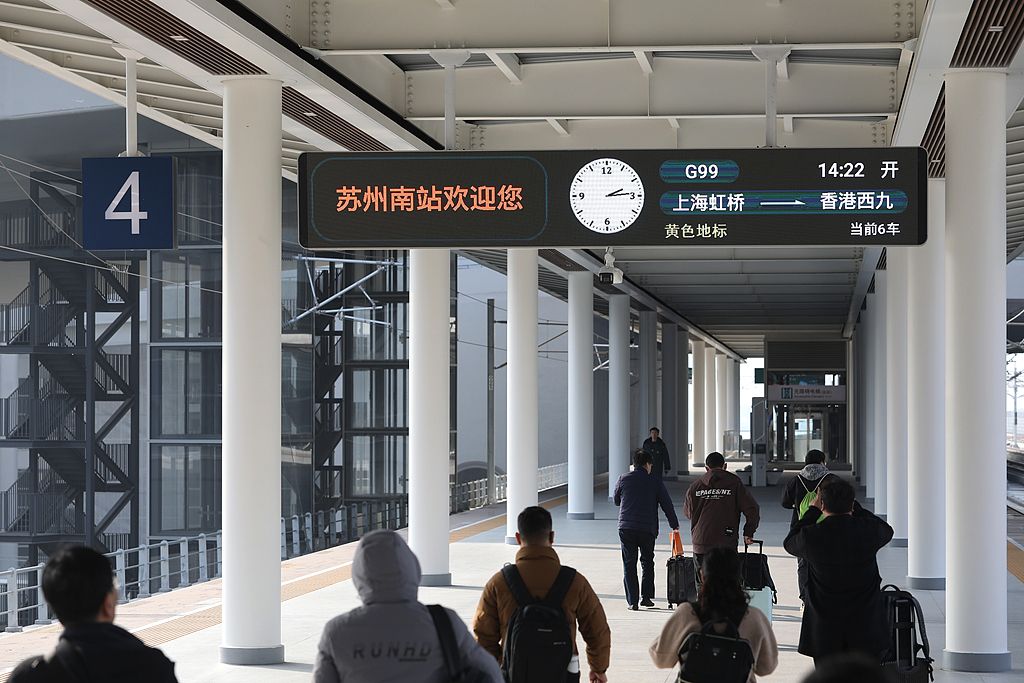 2025年1月5日下午,苏州南站,乘客在乘坐上海虹桥-香港西九龙G99列车。