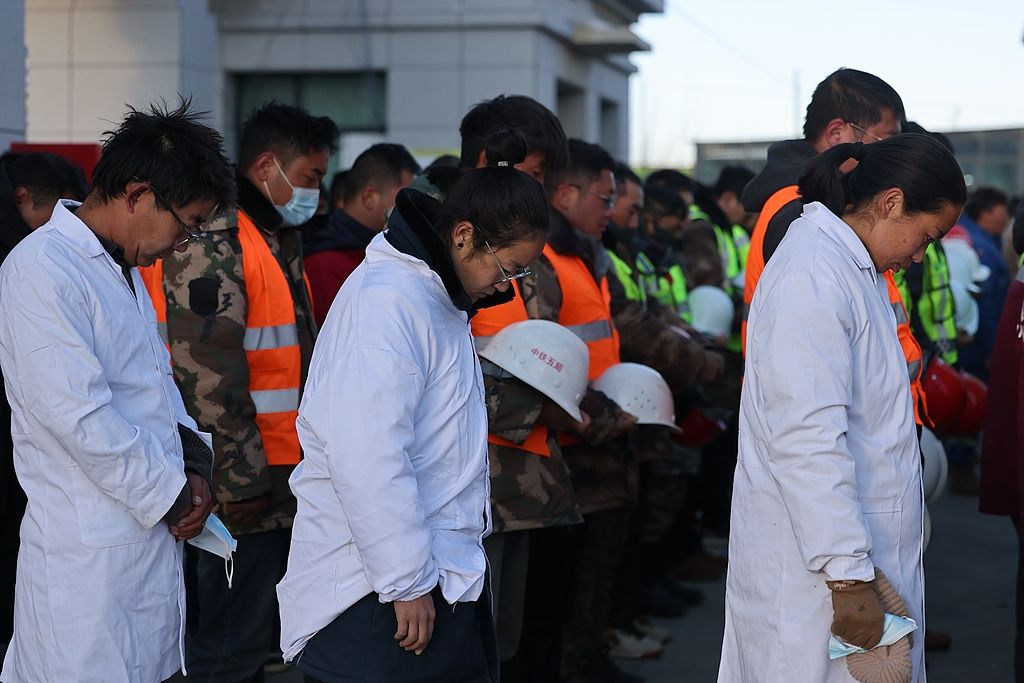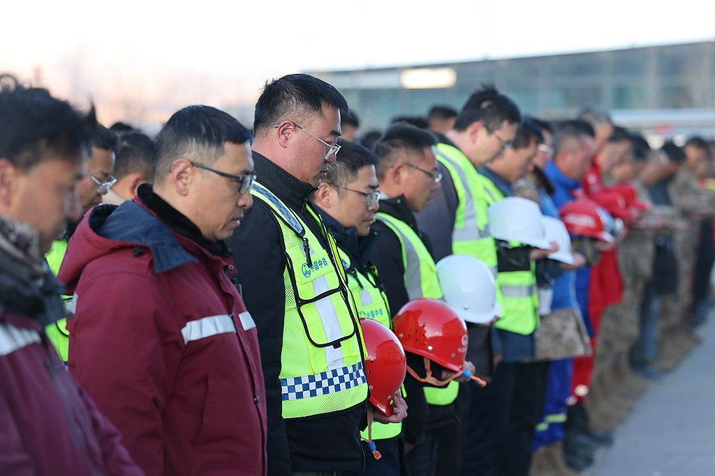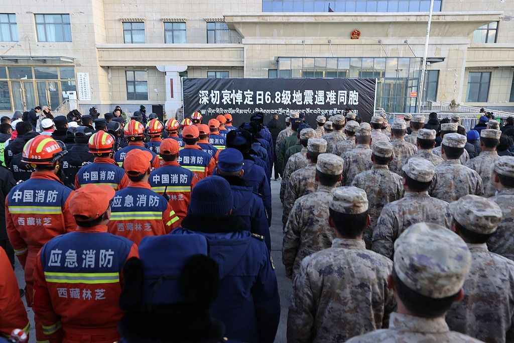 2025年1月13日,西藏日喀则,长所乡举行6.8级地震遇难同胞悼念仪式。参与救援的解放军和武警官兵、消防救援人员、公安民警、医护人员、青年志愿者及有关企业员工、干部职工、震区群众代表数百人,脱帽肃立,向遇难同胞默哀3分钟。