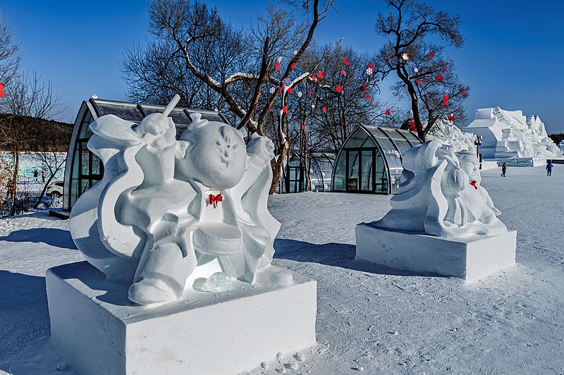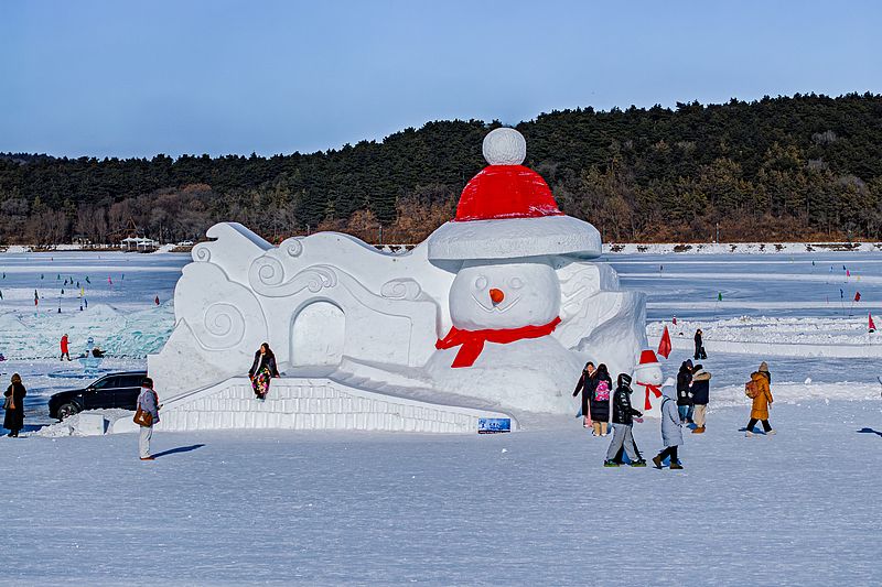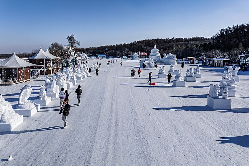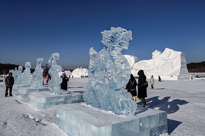 2025年1月11日,长春净月潭雪世界内,利用10万立方米的雪和3000立方米的冰打造的18组73个冰雕雪建筑吸引众多游客。
