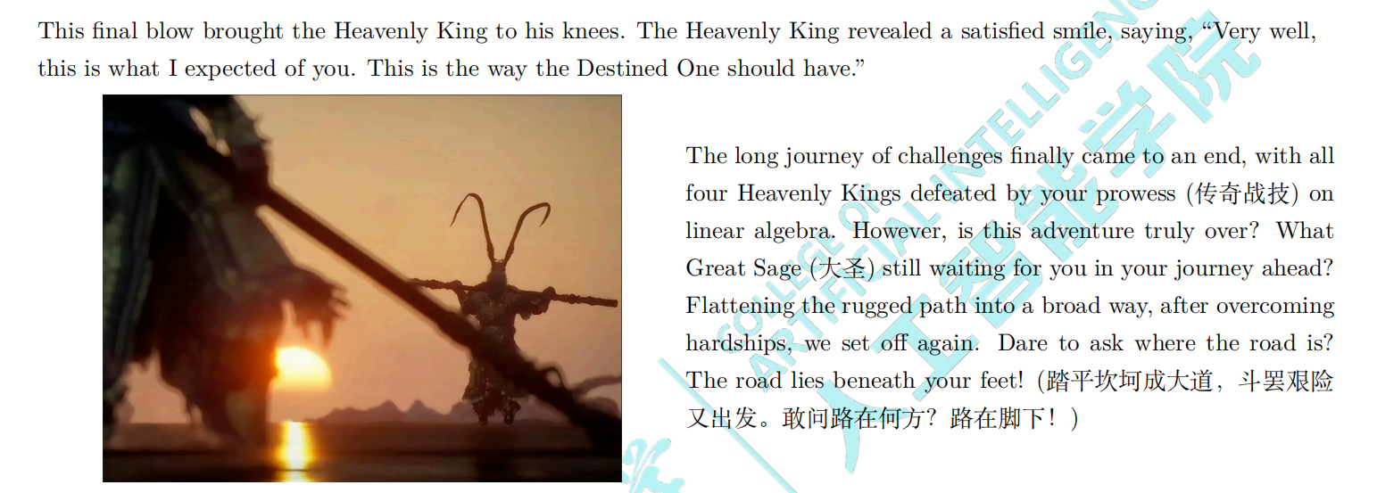 这份别出心裁的试题,出自中石大人工智能学院刘伟峰教授之手,是他为“线性代数”期末考试精心策划的创意之作。在这场期末考试中,“线性代数”不再是枯燥无味的学科符号,而是一场充满挑战与乐趣的奇幻游戏。刘伟峰巧妙融合热门IP——中国首款3A游戏《黑神话:悟空》的元素,设计了一系列寓教于乐、引人入胜的闯关挑战。每位考生都化身为“天命人”,在直接法与迭代法求解线性系统、线性空间、最小二乘与QR分解求解超定系统,以及特征值与奇异值分解等四大核心知识点上,分别向持国、增长、广目、多闻四大天王发起挑战,完成自己的天命之旅。在这场游戏中,学生们不仅深化了对“线性代数”概念的理解,更在解决问题的过程中,体验到了成就与乐趣的双重满足。