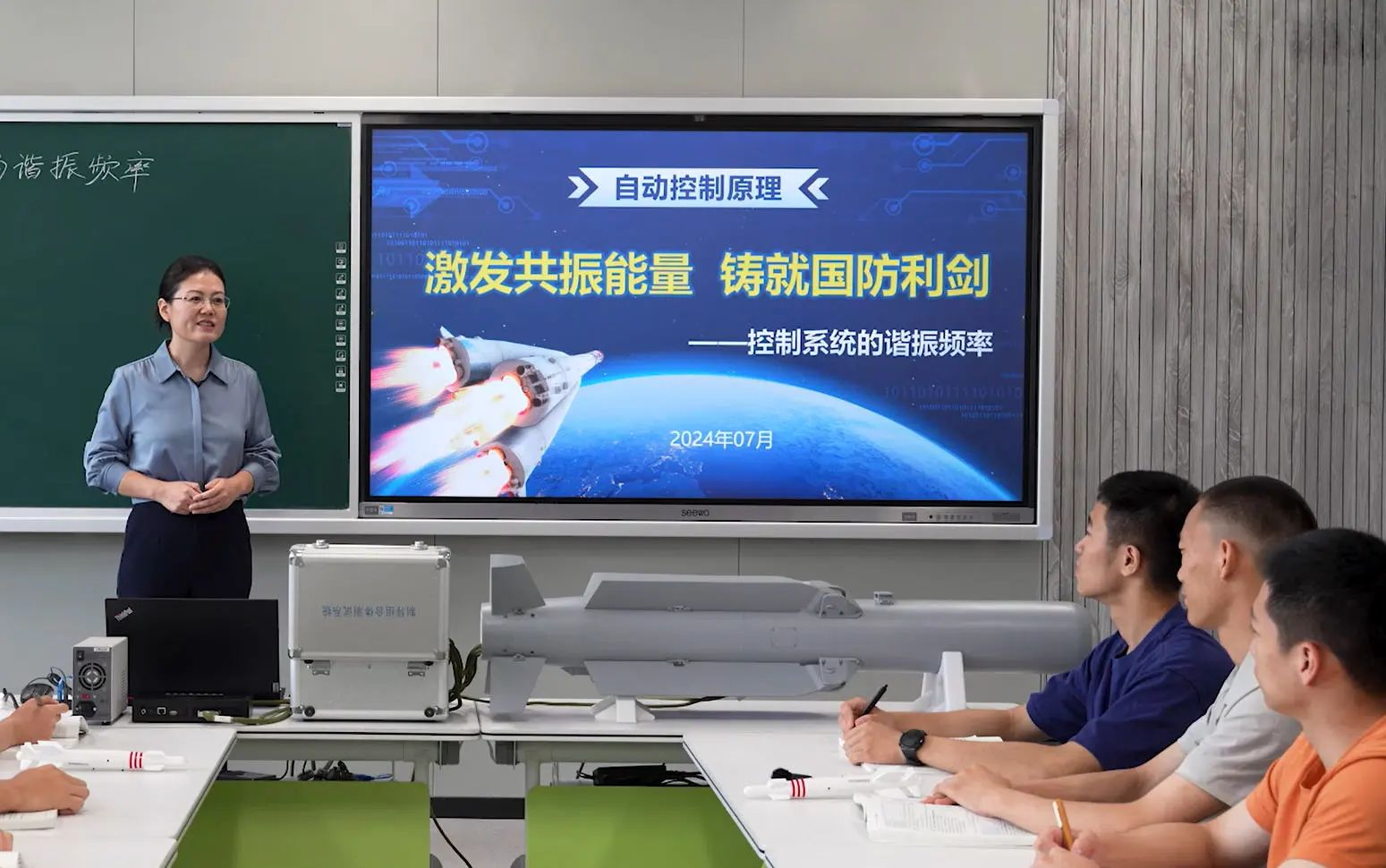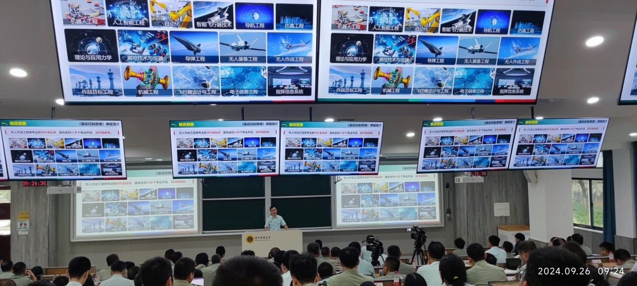 大屏幕上,在珠海航展亮相的激光制导炸弹的展览视频,引起台下学员的热烈讨论。这款武器装备是国防科技大学智能科学学院《自动控制原理》课程教学团队历时10多年研制的成果。将研发的装备“搬上”课堂,讲解专业知识的同时培养学生的科学精神和创新意识,是该课程团队精心架设的课程思政双线脉络的生动实践。