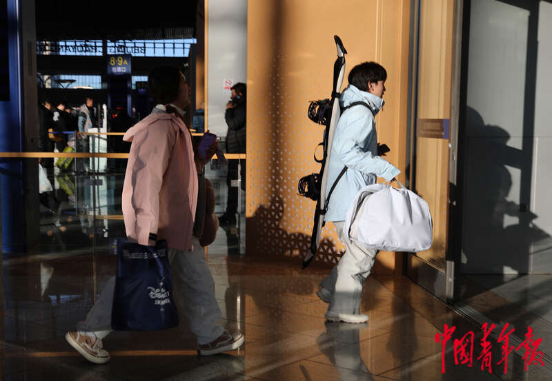 1月14日,北京朝阳站候车大厅,一位年轻的旅客背着滑雪板进站准备乘车。中青报·中青网记者 陈剑/摄