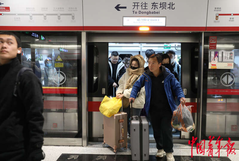 1月14日,北京地铁3号线朝阳站,旅客下车准备去高铁朝阳站乘车。据介绍,北京地铁3号线于1个月前开通。中青报·中青网记者 陈剑/摄