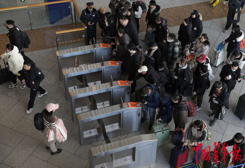 1月14日,北京朝阳站候车大厅,旅客在闸机口检票准备乘车。中青报·中青网记者 陈剑/摄