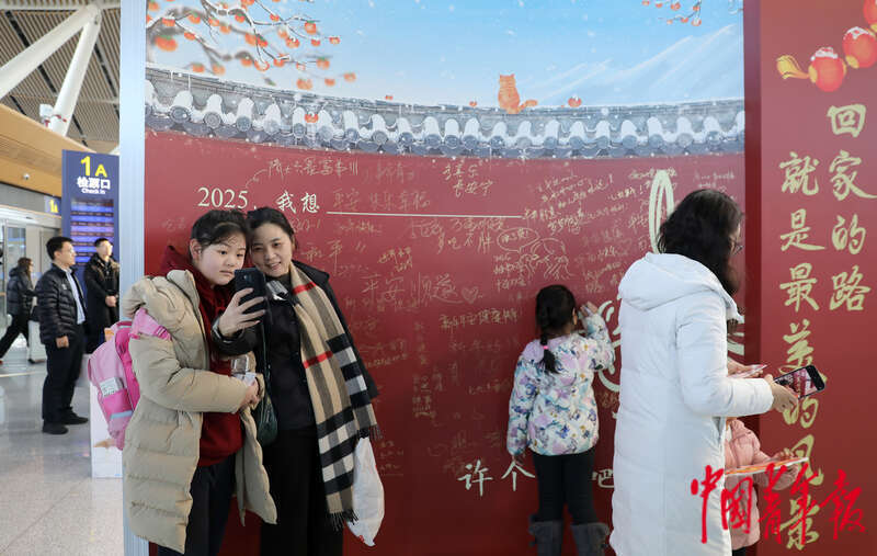 1月14日,北京朝阳站候车大厅,一对母女正在新年祝福语留言板前拍照留念。中青报·中青网记者 陈剑/摄