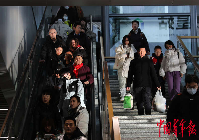 1月14日,北京朝阳站,旅客乘坐扶梯到达站台准备乘车。中青报·中青网记者 陈剑/摄