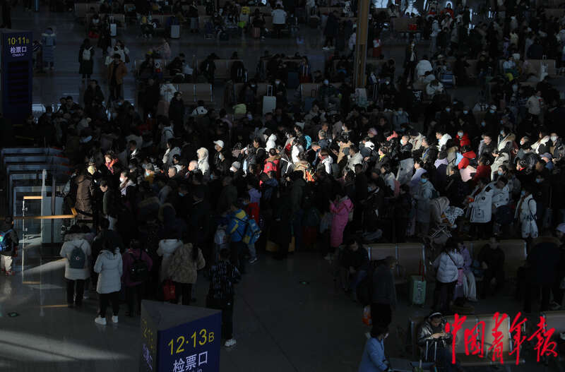 1月14日,北京朝阳站候车大厅,旅客在排队等待检票。中青报·中青网记者 陈剑/摄