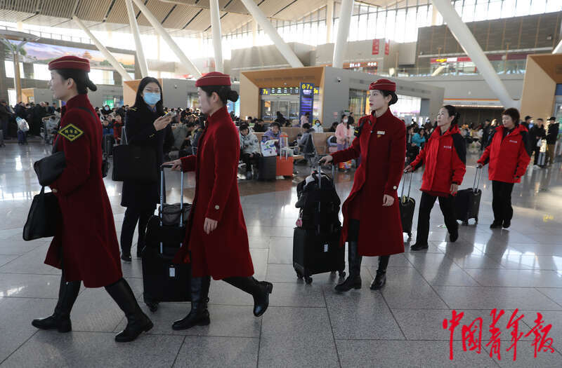 1月14日,北京朝阳站候车大厅,乘务员列队经过。中青报·中青网记者 陈剑/摄