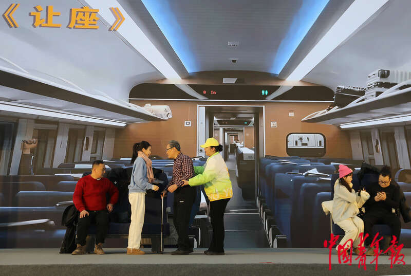 1月14日,北京朝阳站候车大厅,工作人员在舞台上表演节目《让座》。中青报·中青网记者 陈剑/摄