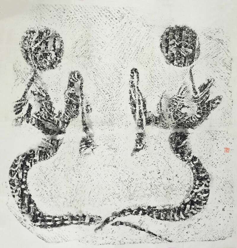 △东汉刻石 近代拓“伏羲女娲捧日月”画像石拓片 上海博物馆