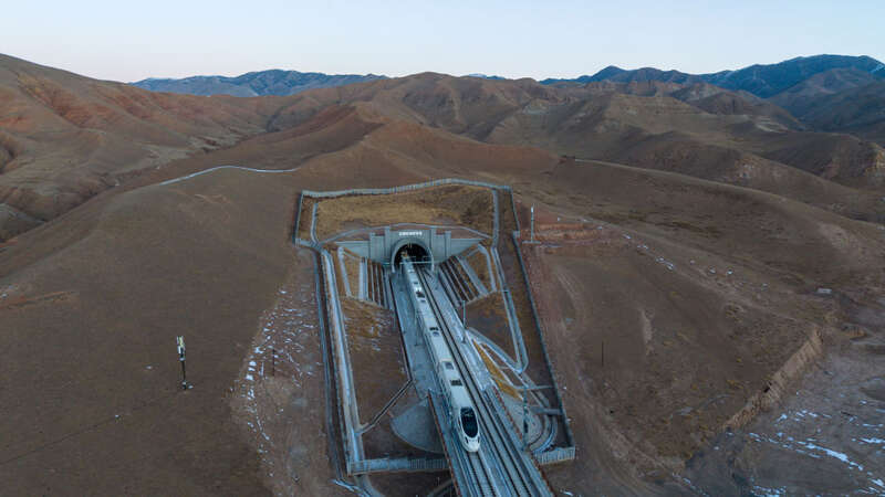 1月14日8时20分许,兰州西发往武威东的D8885次动车组列车穿过新乌鞘岭隧道。这是新乌鞘岭隧道通车后迎来的首列春运列车(无人机照片)。新华社记者 郎兵兵 摄