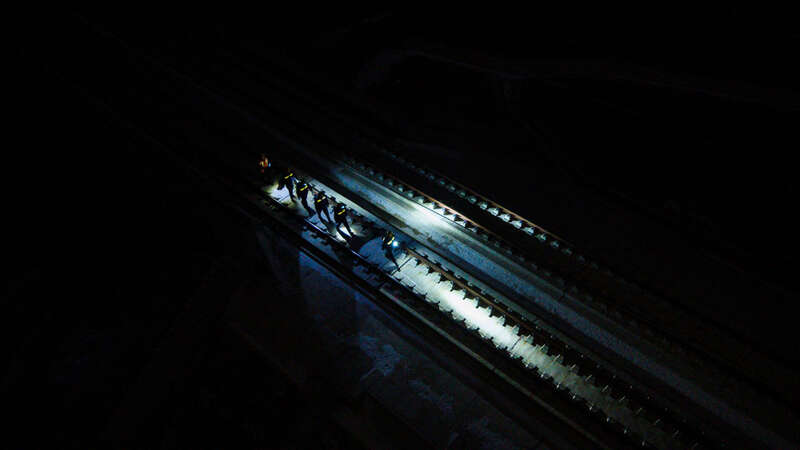 1月14日凌晨,桥隧工前往新乌鞘岭隧道作业地点(无人机照片)。新华社记者 郎兵兵 摄